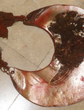 One of the largest we ever found: Very old with the original red pigmented woven band attached to this moon shape mother of pearl collectible, The kina shell was removed from its traditional resin bound tray at one time and I believe that is what caused it to break but because of its importance, it was fixed with local means and resin and continued to be traded between tribes.