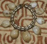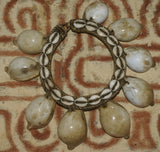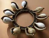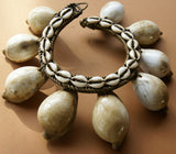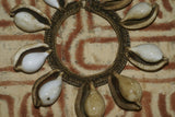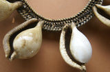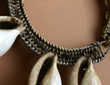 It consists of a hand woven rattan neckband decorated with a smaller cowrie or nassa shells row with, under it, a circle of larger old albino cowries. The large egg cowries have age and patina and are salvaged from older symbolic pieces as the weave deteriorates with the ambient humidity, and are made into new neck adornments.