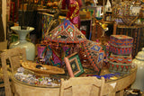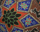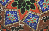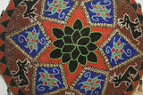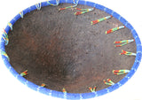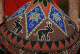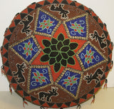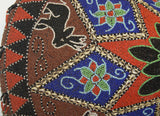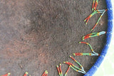 The pattern here displays deer, which is reserved for royalty (since deer have a part of importance in the Ramayana epics), also present are traditional motifs of sacred lotus flowers, and geometric shapes, Additional adornments of small Nassa shell borders, and beaded fringes all around the rim, complete this marvelous and unusual collectible.