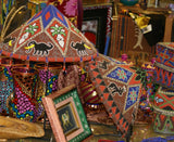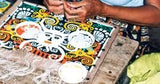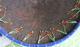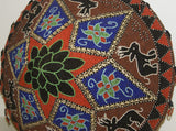 We are showing detailed pictures of this lovely (entirely beaded by hand with a needle) hat, adorned with a tapestry of thousands of minute millimeters’ and colorful antique glass trade beads, hand beaded one by one to form beautiful intricate motifs, and hand stitched within a coolie hat frame to create a mosaic of traditional designs on the outside (with the help of a spider web network of strings as one is seen being made on some the photos), and tightly woven on the inside.