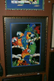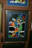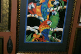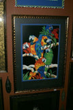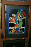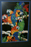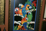 RARE 1988 BARBARA WALLACE LARGE GIGANTIC COLORFUL & VIBRANT POSTER OF MACAW PARROTS DOUBLE MATTED IN UNIQUE SIGNED ARTIST HAND PAINTED FRAME 38"X 27” TROPICAL EXPRESSIONISM ART