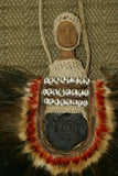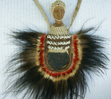 The pectoral decoration or necklace consists of an ancient Ammonite surrounded by Parrot, Lory, cassowary feathers, nassa shells, hand twisted bark twine, hand carved wood carving, in the shape of an ancestor head and meant to protect the owner, a village chief, from evil lurking in the surrounding jungle.
