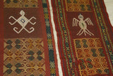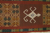 Hand woven ceremonial Sumba Hinggi Ikat Songket Textile 55"x 13.25" Geometric Designs. Handspun Cotton Tapestry, Dyed with Natural Pigments. Adorned with Symbolic Insect Motifs Created with Hand sewn tiny Nassa Shells (SR26) red rust background