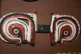 This old hand carved and hand painted Kiadiba was made of solid wood decorated with lime and ochre, and we collected it in the Trobriand Islands, Milne Bay Province, Papua New Guinea on one of our trips there. Trobriand paints are natural pigments and have a short life and usually are renewed often whenever needed. The red paint on Karumosa is a natural earth pigment that is traded in Kula from the people of Dobu Island. The traditional value of this pigment in the Kula trade is due to the fact that no earth pigments are found in the Trobriands and other coral islands. The white paints are manufactured by heating sea shells and crushing them into a fine lime powder. The black paint is a mixture of charred coconut husk and banana stalk sap.