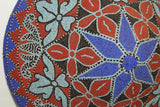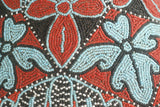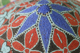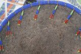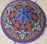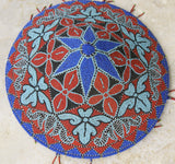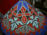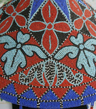 We are showing detailed pictures of this lovely (entirely beaded by hand with a needle) hat, adorned with a tapestry of thousands of minute millimeters’ and colorful antique beads. Hand stitched within a coolie hat frame to create a mosaic of traditional designs on the outside (with the help of a spider web network of strings, as one is seen being made on some the photos), and tightly woven on the inside.