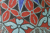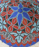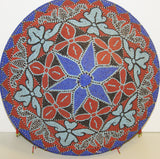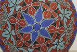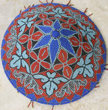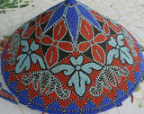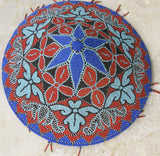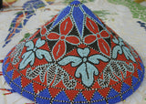 The pattern here displays leaves, sacred lotus and orchid flowers, and geometric shapes, cone is topped with a large blue bloom. Additional adornments of small Nassa shell borders, and beaded fringes all around the rim, complete this marvelous and unusual collectible.