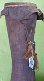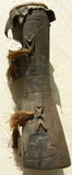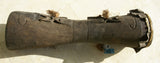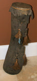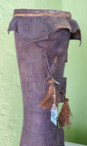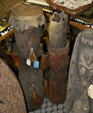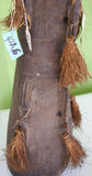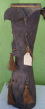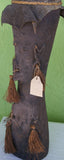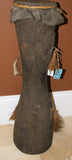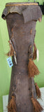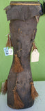 Rare One of a Kind Bigman Tribal Older Wood Kundu Hourglass Hand Held Drum, Hand Carved Percussion Instrument with Dried Palm Tassels decorations, original monitor skin, Huon Gulf, Eastern New Guinea 1980's, Melanesia 42A6