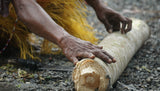 The Sentani lake area of Irian Jaya is famous for abstract paintings written or painted on bark. The wood used is usually wood Khombouw: the outer bark is loosened with beaters, then peeled off from the trunk of the tree by banging the timber, then it is skinned, cut in sections and cleaned by scraping it with a shell. Later The cloth is soaked in water, wrung out, pounded to flatten and then hung up in the sun to dry, a tedious and time consuming process: The thinner, inner bark has been worked with beaters until the cloth has the right thickness and dimensions.