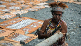 The Sentani lake area of Irian Jaya is famous for abstract paintings written or painted on bark. The wood used is usually wood Khombouw: the outer bark is loosened with beaters, then peeled off from the trunk of the tree by banging the timber, then it is skinned, cut in sections and cleaned by scraping it with a shell. Later The cloth is soaked in water, wrung out, pounded to flatten and then hung up in the sun to dry, a tedious and time consuming process: The thinner, inner bark has been worked with beaters until the cloth has the right thickness and dimensions.