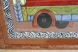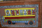 RARE UNIQUE COLORFUL FOLK ART PAINTING PAPUA NEW GUINEA HUMOROUS ARTIST: TRIBAL WARRIORS TRAVELLING BY BUS & FRAMED IN SIGNED HAND PAINTED FRAME TO MATCH THE ART DESIGNER COLLECTOR WALL CARTOON ART 38" X 27” HUGE DFP1