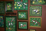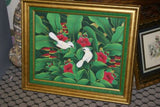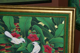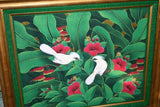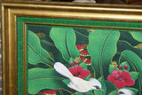 25”x 21” ORIGINAL MASTERPIECE COLORFUL BALINESE PAINTING ON CANVAS RENOWN UBUD ARTIST RAINFOREST PARADISE WITH FOLIAGE HIBISCUS STARLING BIRDS FRAMED IN SIGNED CUSTOM FRAME HANDPAINTED TO MATCH ARTWORK DFBB1 DECORATOR DESIGNER ART COLLECTOR