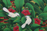 Tropical scenery, a signed original painting on canvas, with outstanding crested starling birds, and bird of paradise flowers, trees and banana leaves and red hibiscus etc...