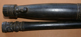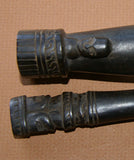 This set is very old, unique with a nice patina too, hand carved wood (possibly ebony) with nice hand carved motifs of ancestor faces on both instruments (for protection against evil lurking in the wood) on each side of the cup base, and some ancestor carvings on the pestle also.