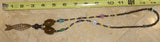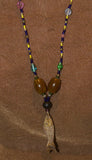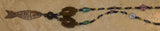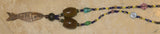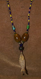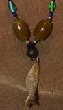 1 Talisman necklace with varied vintage glass trade beads, metal beads, 2 large rust color large amber beads, and a hand carved buffalo bone fish “Pisces” pendant, Dayak Tribe, Borneo. Pisces Symbol, Zodiac March Sign. All handmade. Collected in Indonesia.